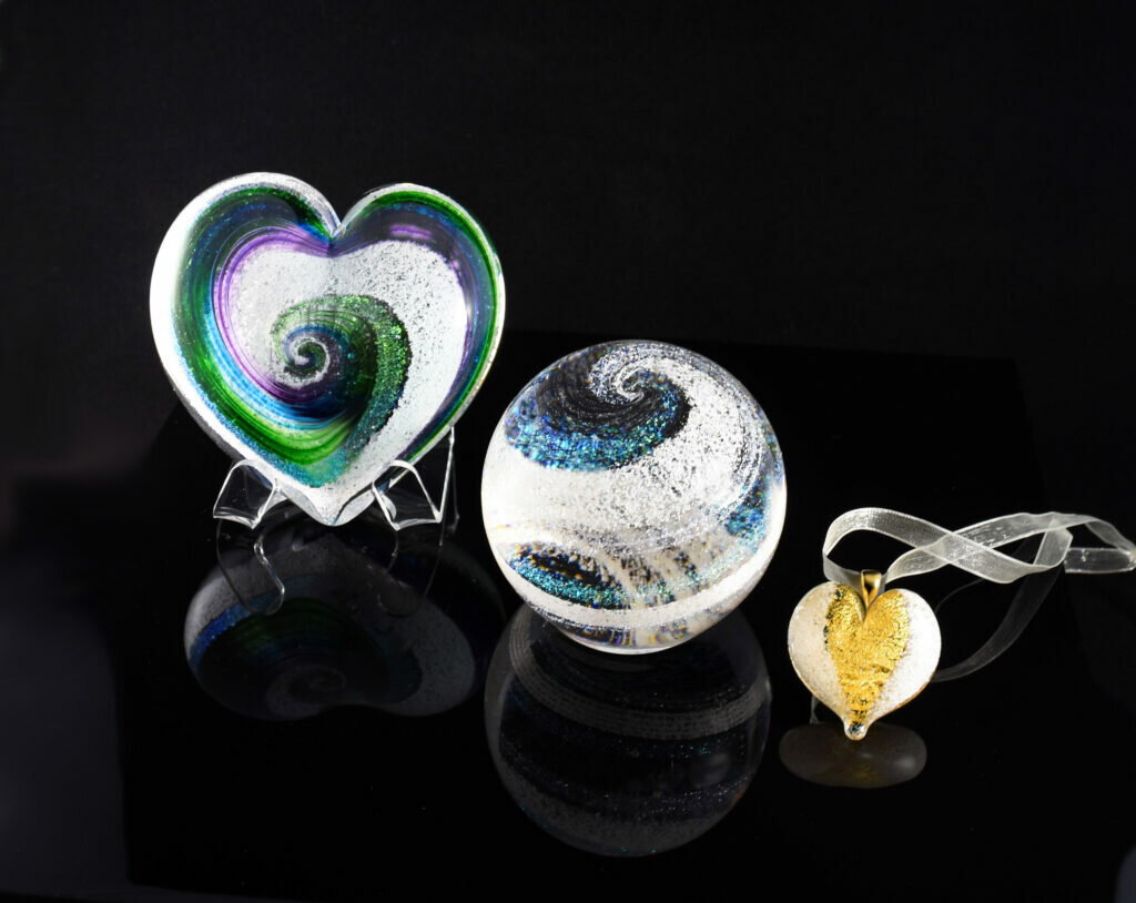 Glass Cremation art combines the cremated remains with beautiful glass designs. Available in all shapes, sizes and colors these are perfect table pieces. They are usually hand blown and done with great expertise. Artists use a variety of techniques that give the glass unique shapes and colors.